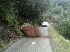 Jeudi 12 avril vers midi, un rocher de belle taille estimé à 2,5m3 est tombé sur la route départementale 320 à 300m du carrefour de Nojaret en montant vers Bonnevaux. Ce rocher obstrue la route empêchant le passage des véhicules. Pour relier le bas de la commune au village, il faut pour le moment faire le détour par Malbosc. La DDE a été prévenue et devra procéder au fractionnement et à l’enlèvement de ce rocher ainsi qu’à une purge au dessus de la route où d(autres blocs ont pu être destabilisés. On tremble cependant à l’idée que ce bloc aurait pu s’écraser sur un véhicule qui passait à ce moment. D’autres secteurs sur cette route escarpée devraient peut-être faire l’objet de vérifications, à la sortie de cet hiver marqué par le gel et de nombreuses intempéries.
